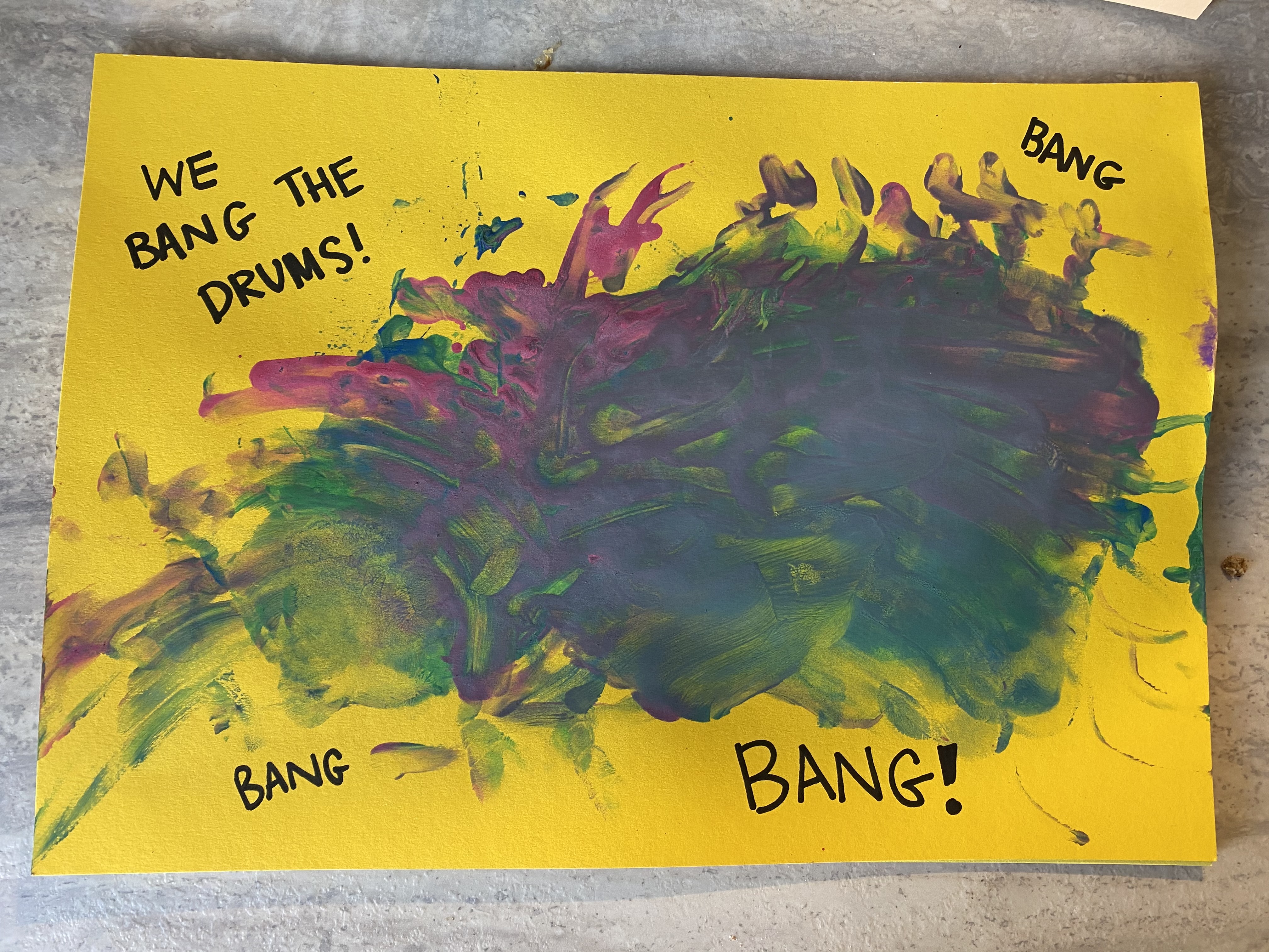 With some painted hands and feet, big sheets of paper, and a fun playlist, we created a musical masterpiece. We did some dancing and jumping, and we even played the drums with our hands.