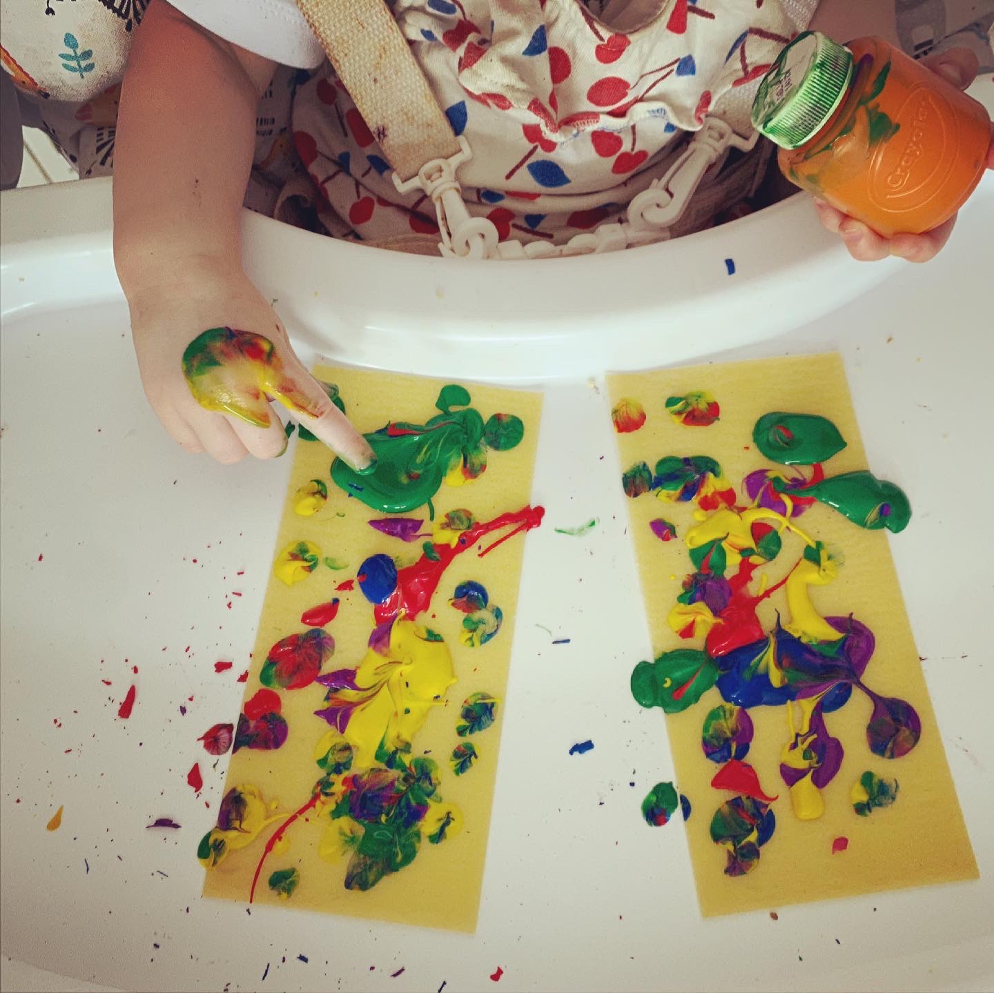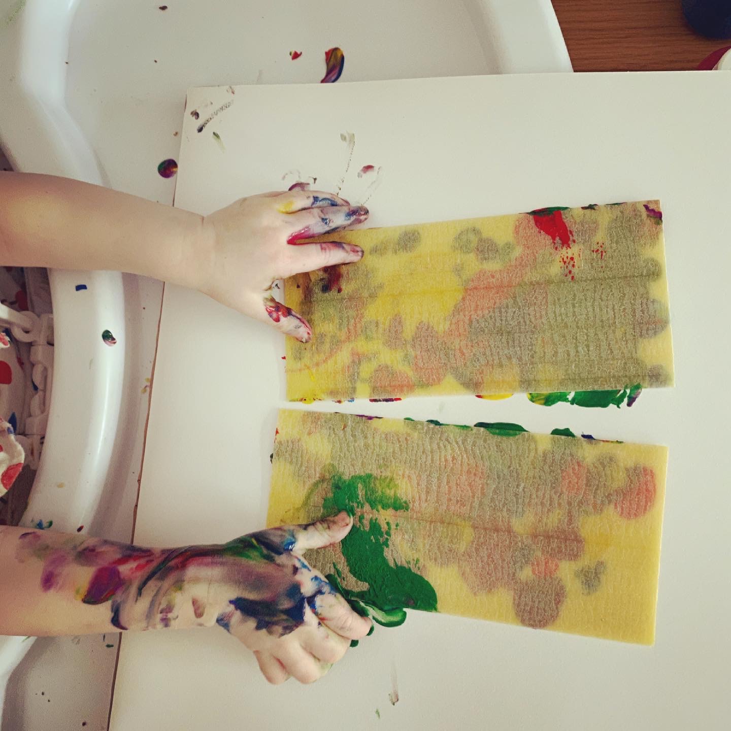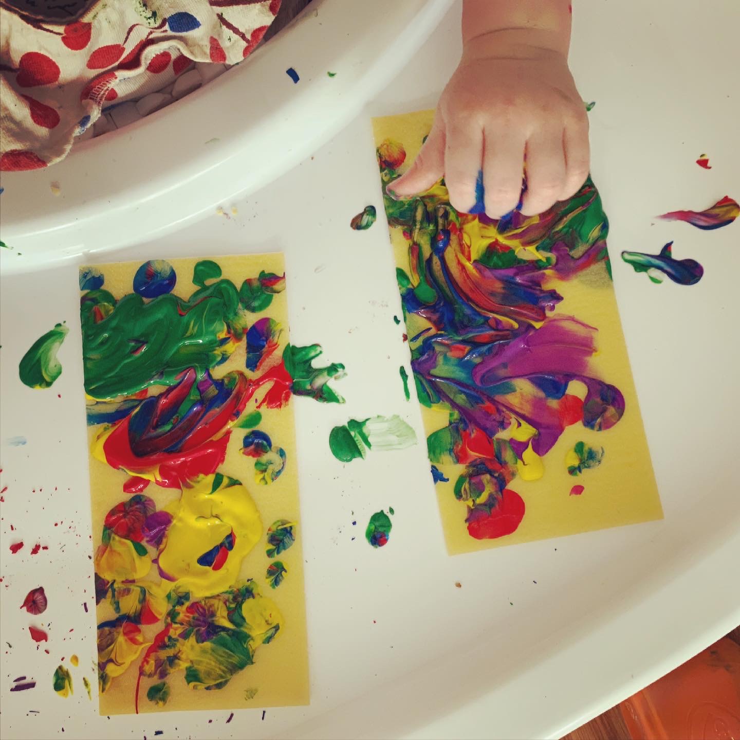 My 12 month old had a lot of fun with this activity! Using two uncooked lasagna sheets, I dropped some paint blobs on and just let her go mad.