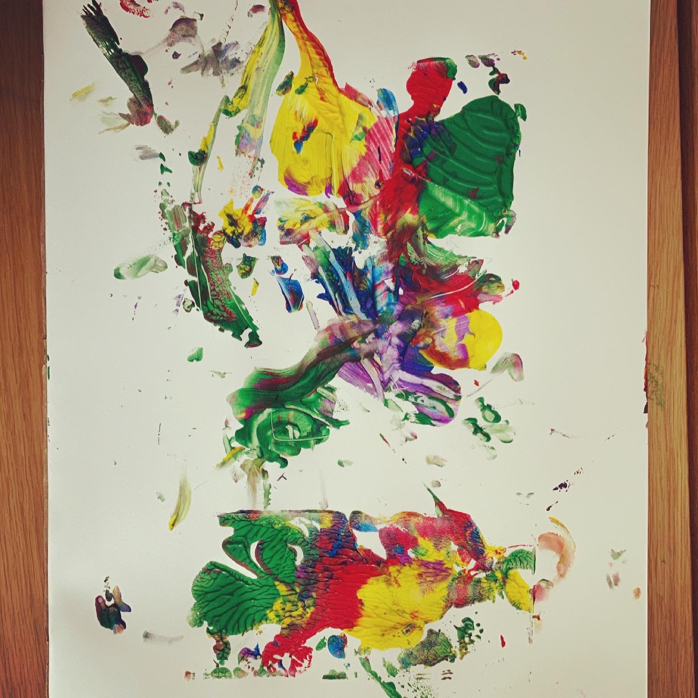 She squashed the paint on the lasagna with her hands, then we turned them upside down onto a piece of card. Great trick for dexterity – she had to peel the painted lasagna off the card which was a little tricky due to the suction caused by the paint. Then she had great fun banging the sheets together and pulling them apart when they stuck together. 😂