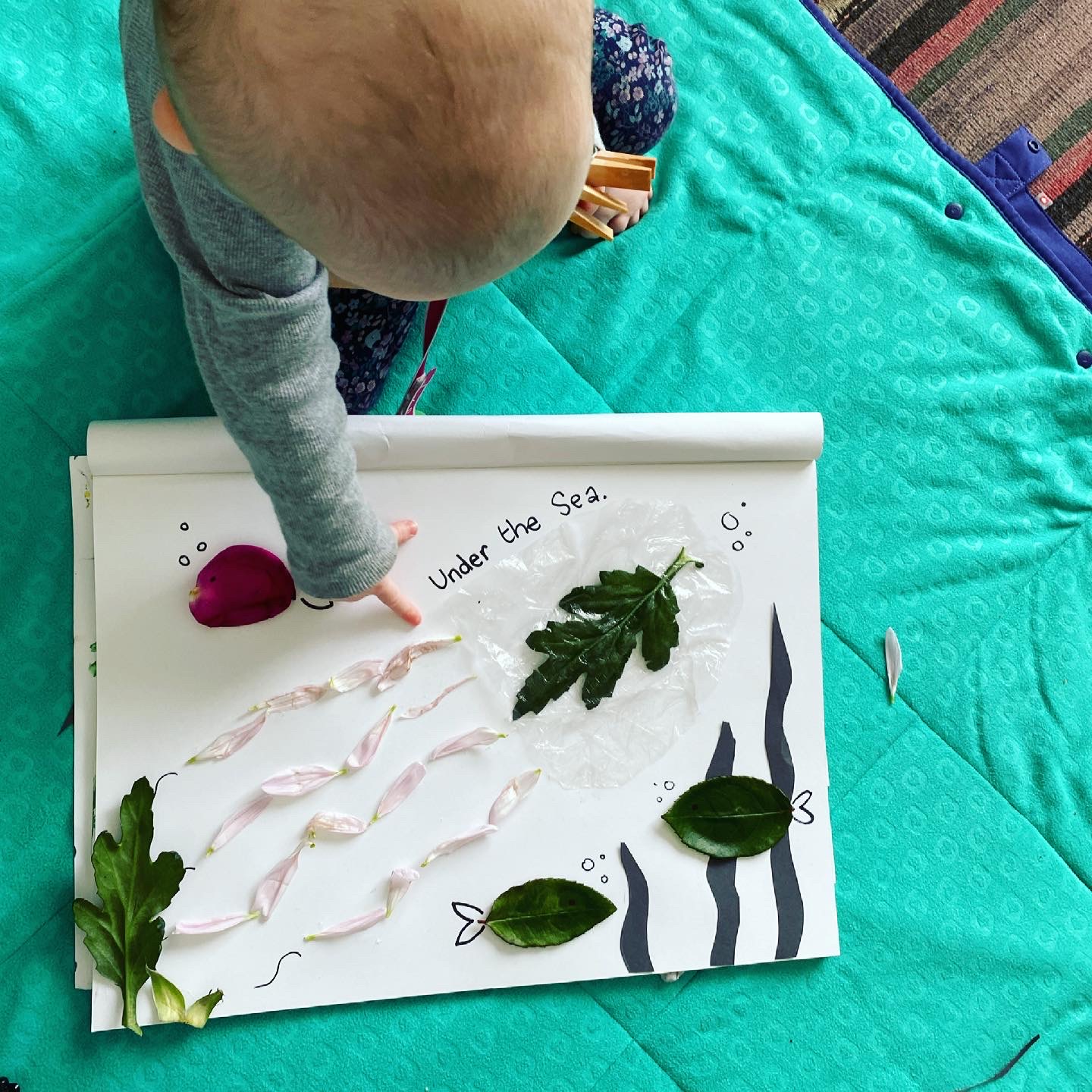 To make the jellyfish we folded a sheet of cling film around a leaf and cut the jellyfish shape around it. Then we stuck it to the page. It creates a nice 3D effect and Lila liked the sensation of squishing and crinkling it, so it’s a sensory bonus for little ones! 😊
