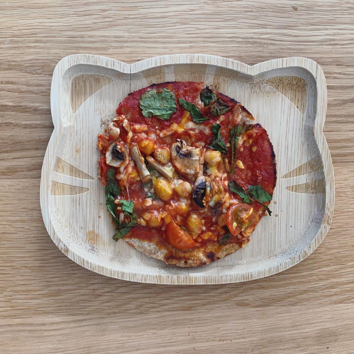 Just get a tortilla, load with your toppings and pop in in the oven. We used Passata for our tomato base, then threw on some cheese, mushrooms, tomatoes, chick peas and spinach.