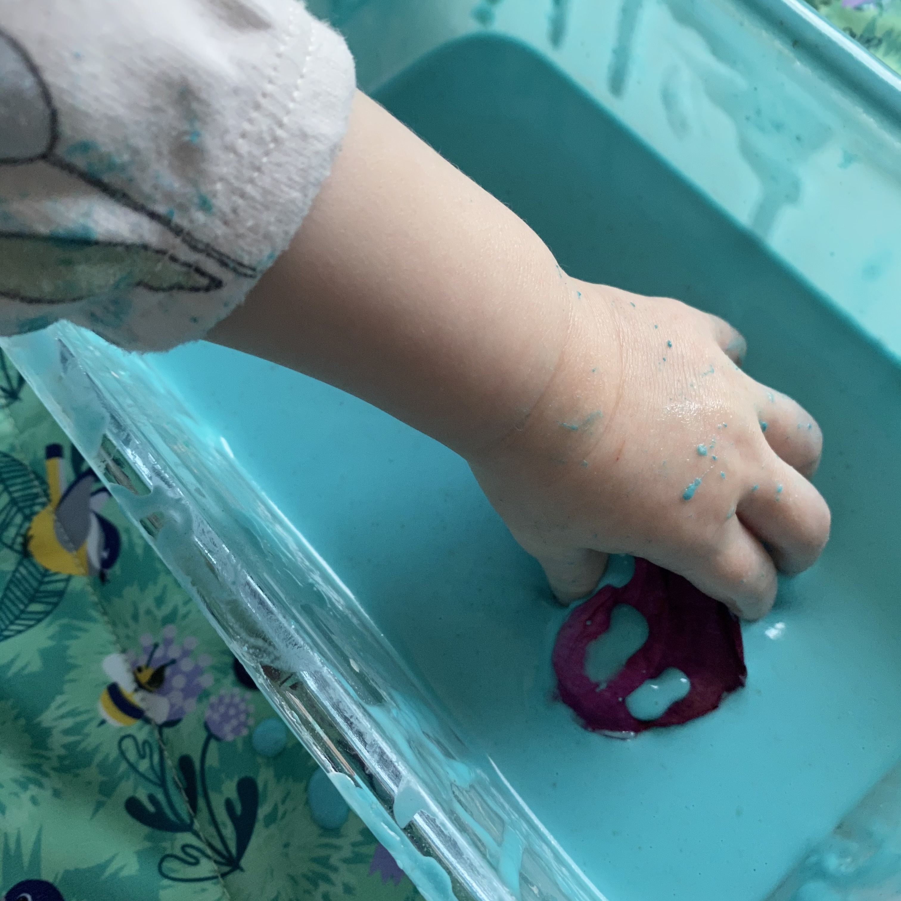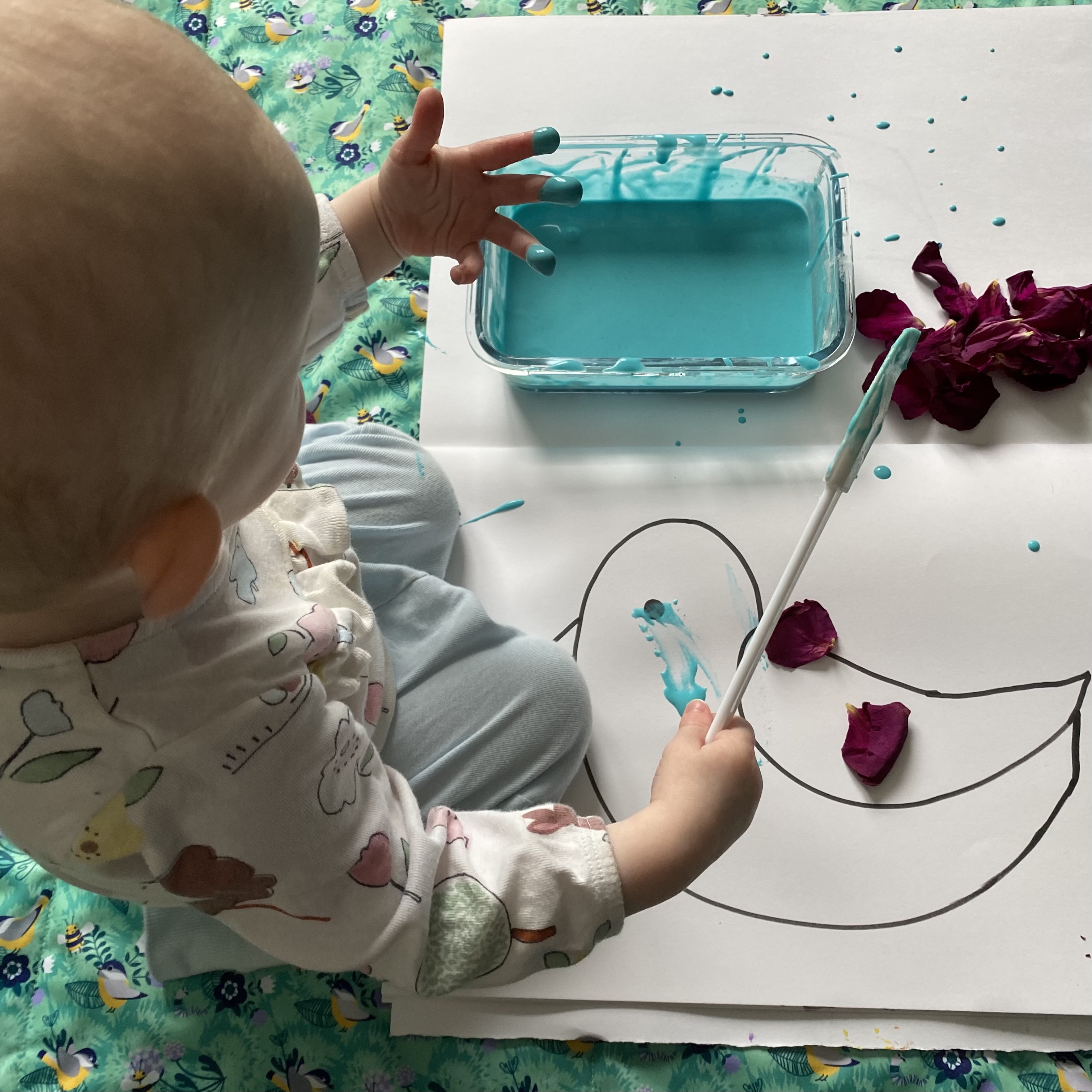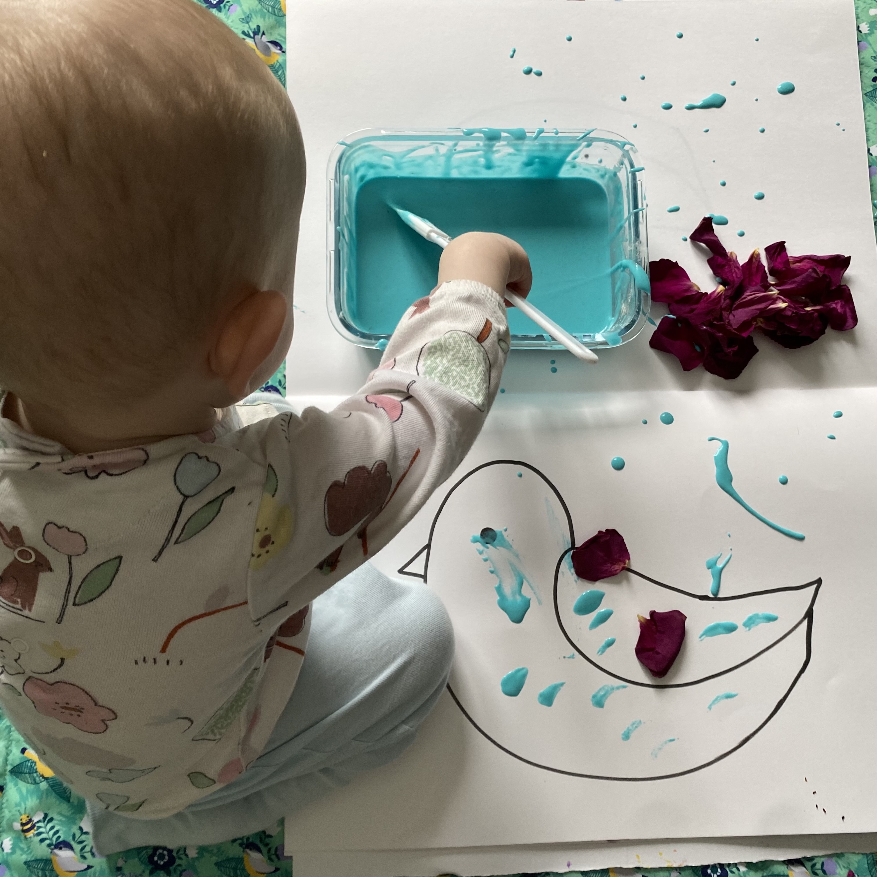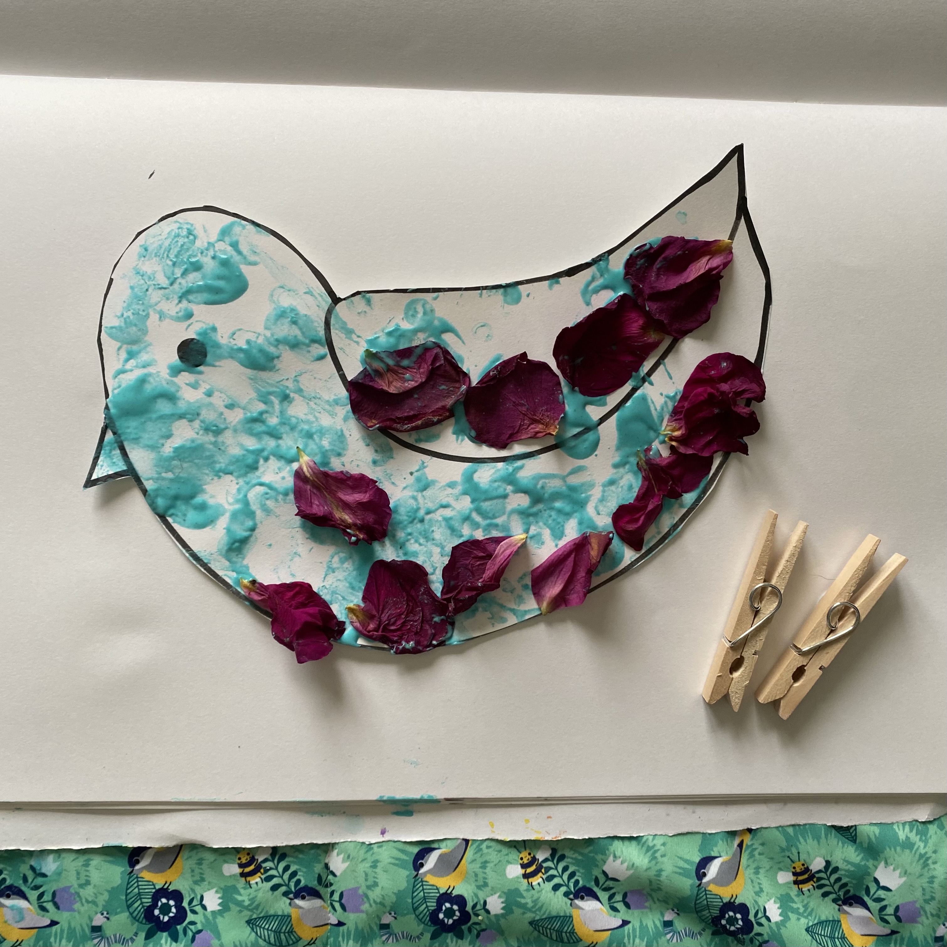 After making a bird shape, Lila used a spatula, her hands and rose petals to paint and stamp. The petals also stuck nicely to the card to give a pop of colour.